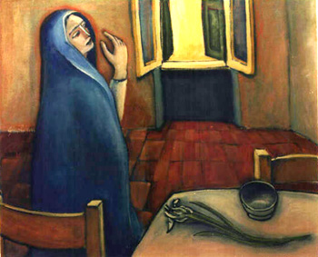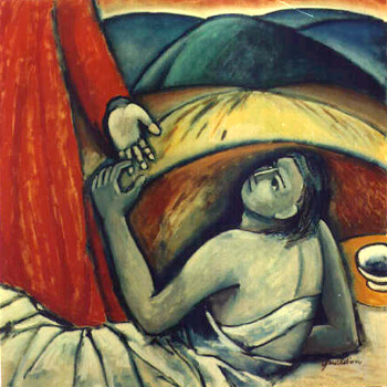 Carico di struggente malinconia è il dipinto "Le ultime messi" (1986, olio su tela, 150x150 cm): una donna siede pensosa davanti ad una grande finestra aperta, che si affaccia su un campo di grano maturo e biondeggiante, oltre il quale l'orizzonte è escluso dalla mole ingombrante di un cantiere di un edificio in costruzione, sovrastato dalla gru di acciaio, nuovo campanile dell'effimero, che non trasmette note armoniose nell'aria circostante, ma rumori che annunciano la fine di un'era: il colore luminoso delle ultime messi di quel campo sarà presto cancellato dal cemento.