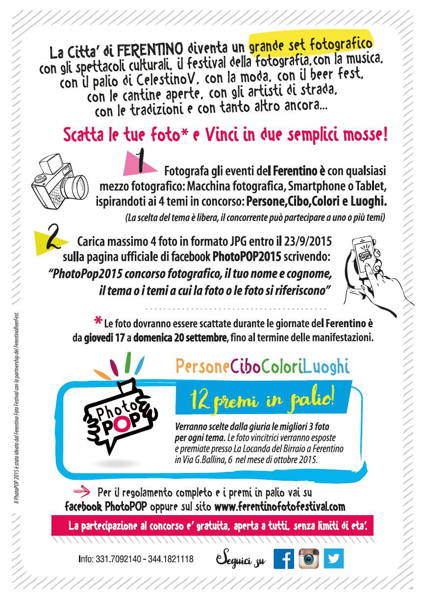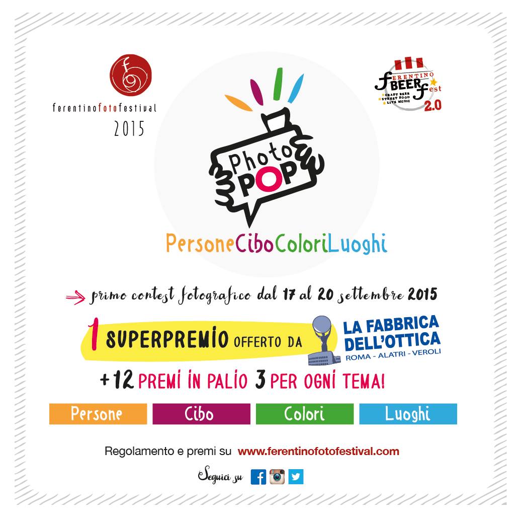 Con Ferentino è la Città diventa un grande set fotografico, con gli spettacoli culturali, con il festival della fotografia, con il palio di Celestino V, con la musica, con la moda, con il beer fest, con le cantine aperte, con gli artisti di strada, con le tradizioni e con tanto altro ancora... Sarà come trovarsi davanti ad una “scatola magica”, al quale interno ce n’è un’altra e un’altra ancora. Ognuna di esse conterrà un Ferentino è, metafora di ciò che vediamo e viviamo in quei giorni. Scatta e Vinci, 12 premi in palio, 3 per ogni tema e ...un superpremio per la foto più votata!!! www.ferentinofotofestival.com/home/photo-pop/