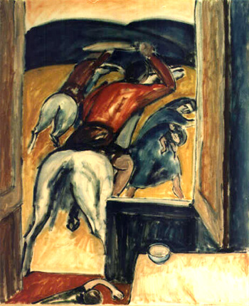 Una poetica riflessione sulla vita quale viaggio alla ricerca della felicità è suggerita dalle rappresentazioni dei capannoni variopinti del circo, di cui "Il circo" (1975, olio su tela, 70x90 cm) e "Circo in periferia" (1980) sono emblematico esempio. Il tendone a strisce rosse e bianche è ben piantato a terra, ma i suoi contorni sinuosi denunciano la consistenza leggera del tessuto. È mattino e bianchi cavalli pascolano nel prato antistante il circo durante una pausa dagli esercizi, prima di esibirsi in serata. I cavalli sono segno della libertà e, se ci ricordano la bellezza della vita e la passione per l'arte, ricordano anche la necessità del diuturno esercizio del lavoro (cfr. "Cavalli allo stato brado", 1986; "Cavalli e domatore", 1991), la necessità di pensare a nuove terre da raggiungere, di avere il coraggio indispensabile per superare nuove prove.