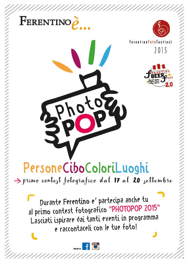 Con Ferentino è la Città diventa un grande set fotografico, con gli spettacoli culturali, con il festival della fotografia, con il palio di Celestino V, con la musica, con la moda, con il beer fest, con le cantine aperte, con gli artisti di strada, con le tradizioni e con tanto altro ancora... Sarà come trovarsi davanti ad una “scatola magica”, al quale interno ce n’è un’altra e un’altra ancora. Ognuna di esse conterrà un Ferentino è, metafora di ciò che vediamo e viviamo in quei giorni. Scatta e Vinci, 12 premi in palio, 3 per ogni tema e ...un superpremio per la foto più votata!!! www.ferentinofotofestival.com/home/photo-pop/