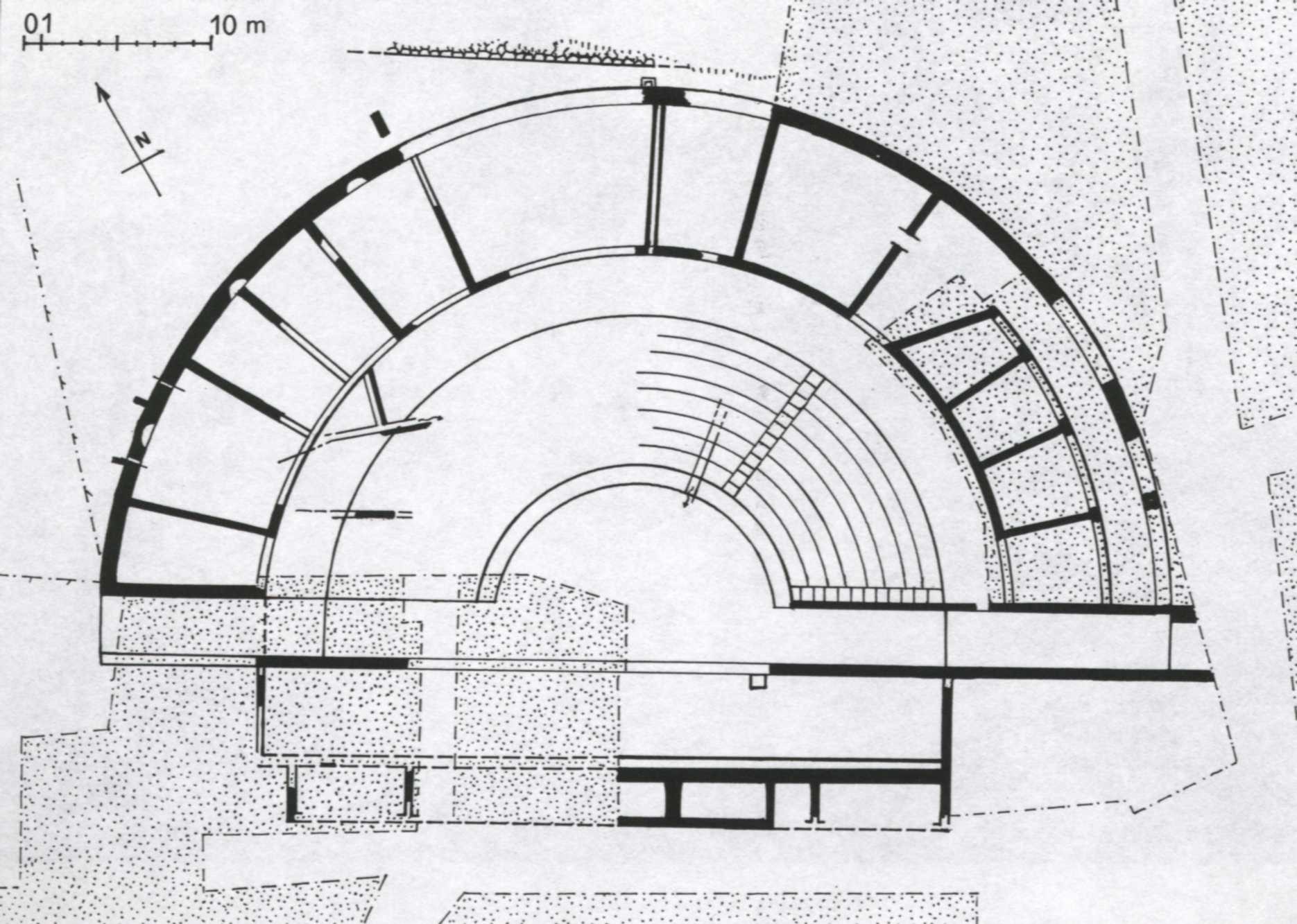 Ferentino, map of the Roman theatre - Rendering by Quilici - Gigli